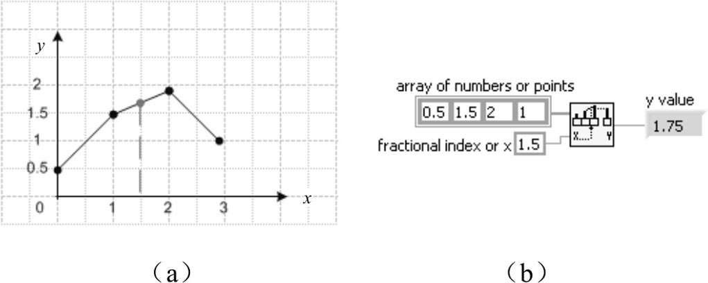 例如,如图3-41所示,一维数组中含有元素0.5、1.5、2、1,如果用数组的索引作为坐标系的 x 值,则各个点在坐标系中的分布如图3-41(a)所示。如果要根据线性插值方法获取坐标系中 x 轴上值为1.5的点对应的y值,函数首先根据索引1.5找到数组中距其最近的两个元素值,在坐标系中坐标为(1,1.5)和(2,2),此后按照线性插值公式可得 x k =1.5时, y k =1.75。在使用线性插值函数时需要注意: