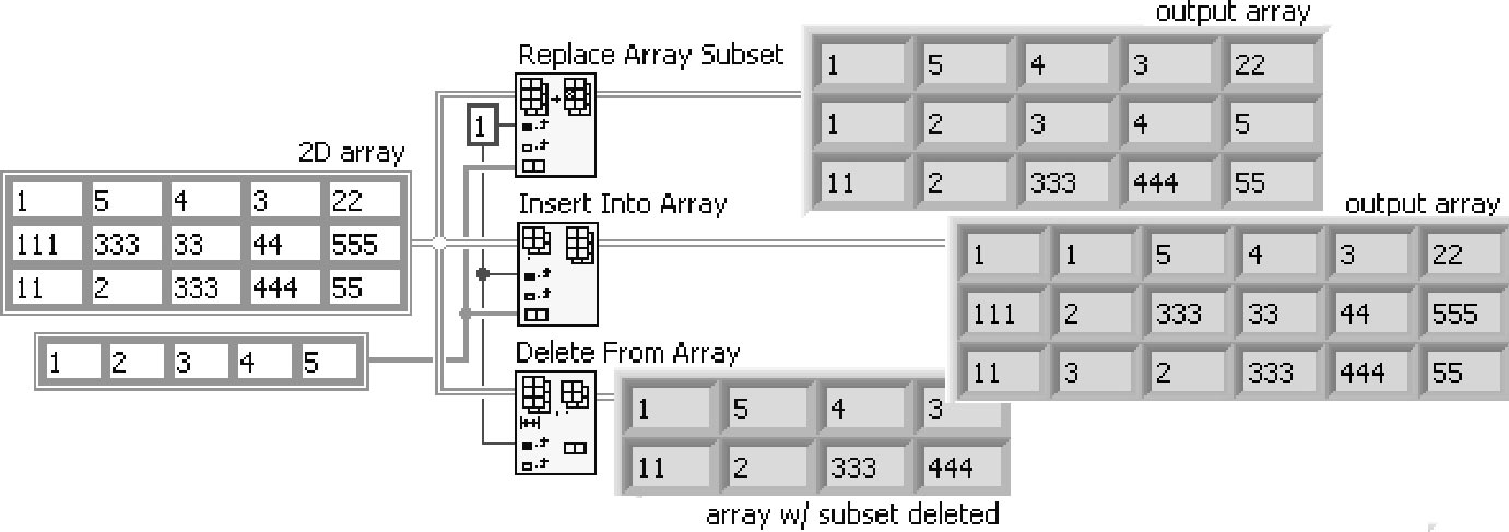LabVIEW还提供了对一维数组和多维数组进行插入、替换和删除等操作的函数。图3-37显示了用一个一维数组替换二维数组中第二行数据、将一个一维数组插入二维数组中第二列以及删除二维数组第二行数据的例子。需要注意的是,在进行插入、替换和删除操作时,必须按照小于输入数组的整维数进行。例如对二维数组进行这些操作时,所插入、替换或删除的部分必须为同长度的行或者列。此外,如果要在数组最末端添加元素,可以使用组件数组函数。