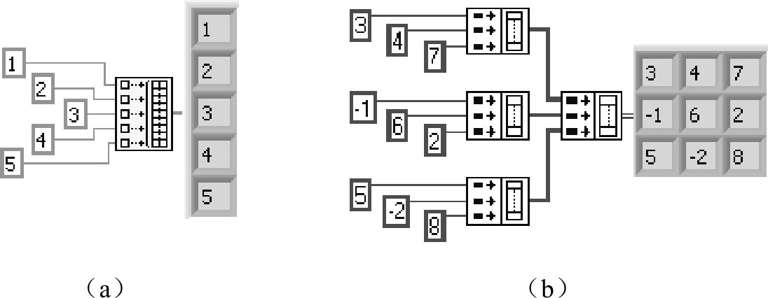 在程序运行时也可以动态创建数组或对数组进行初始化。使用“数组构建”(Build Array)函数可以在程序代码中使用多个常量、变量或数组作为输入创建一个新的数组。开始时,数组构建函数只有一个输入端子,设计人员可以根据需要来改变输入参数的数量。如果要添加其他的输入,可以使用函数右键菜单中的“增加数组输入”(Add Array Input)和“减少输入”(Remove Input)选项,或者通过改变函数图标尺寸来增减输入参数个数。当数组构建函数输入参数均为数组时,可以实现多个数据的链接;用一个数组作为输入参数,多个常量或变量作为其余输入参数可实现数组的动态增长。另外一种动态创建数组的方法是利用循环的自动索引功能。For循环或While循环有一种称为“自动索引”(Indexing)的功能,当数组作为循环的输入时,使用它可以自动地按顺序索引数组元素并输入循环中,供每次循环使用;也可以自动按顺序连续累积每次循环中的常量、变量或数组,将这些数据打包成一个新的数组作为循环的输出,其中常量、变量将组成一维数组,一维数组将组成二维数组,以此类推。默认情况下,对于每个连接到For循环的数组都会执行自动索引功能。可以禁止这个功能的执行,方法是在循环数据通道的右键菜单中选择“禁止自动索引”(Disable Indexing)选项。有时需要使用某一个固定值在程序运行时动态创建并初始化数组,可以使用LabVIEW提供的“数组初始化”(Initialize Array)函数,通过函数的右键菜单或更改函数图标的尺寸来增加函数的“输入维数”实现一维或多维数组的创建或初始化。