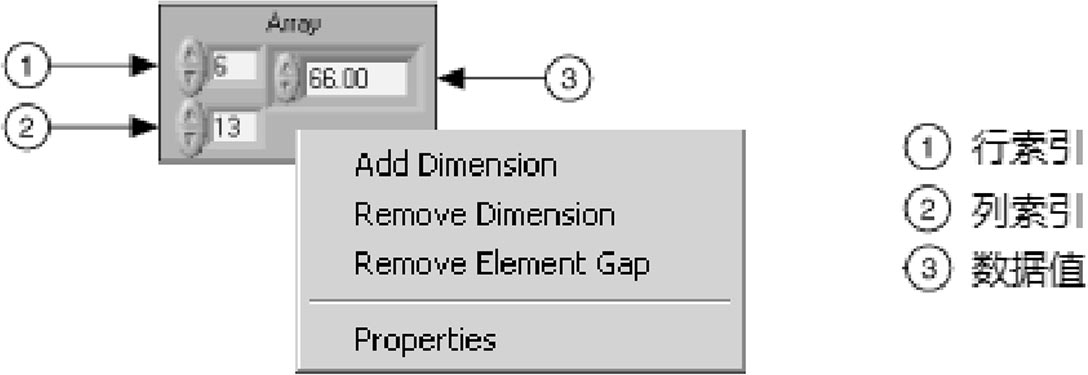 多维数组可以在创建一维数组后,通过数组对象右键菜单中的“添加维数”(Add Dimension)选项来生成。也可以通过数组对象右键菜单中的“减少维数”(Remove Dimension)选项来降低多维数组的维数(图3-29)。