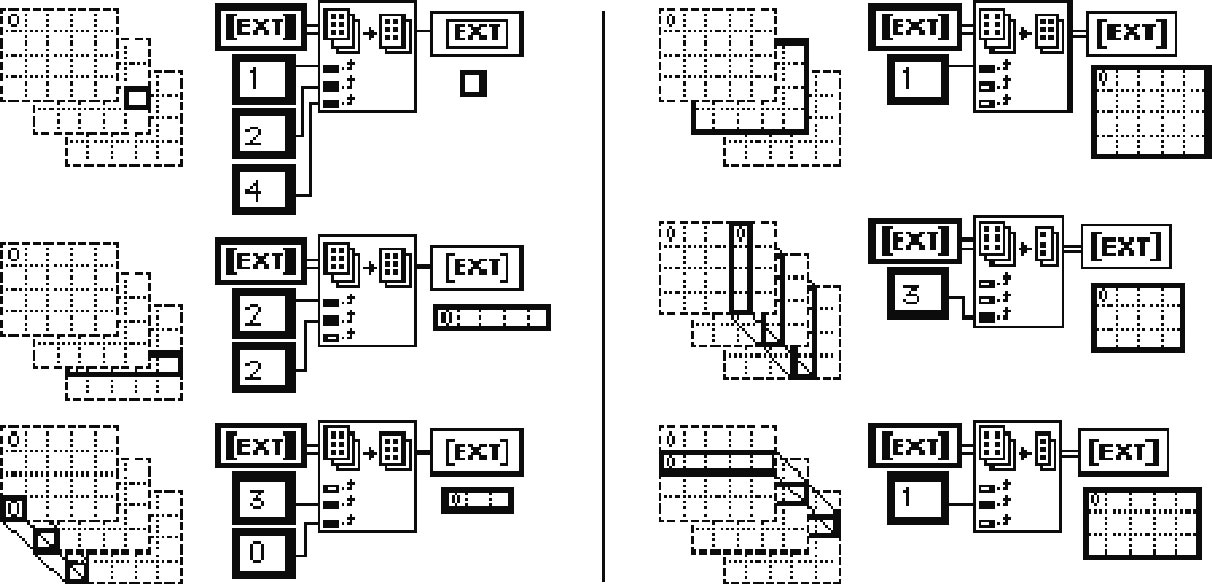 同理,也可以通过禁止两个索引端子,从一个三维数组中提取一个二维数组;或者通过禁止一个索引端子提取一个一维数组。图3-35显示了从三维数组提取数组的各种方法。