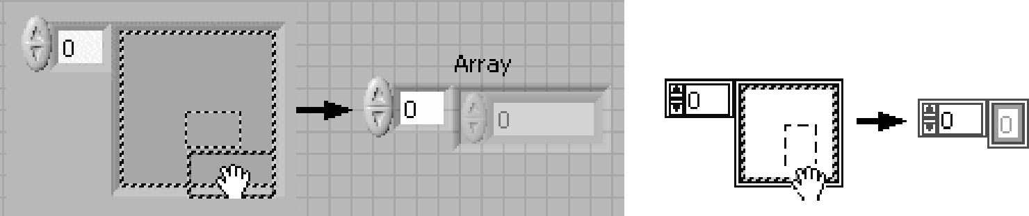 在设计时,数组创建一般需要通过两步来完成:一是创建“数组外壳”(Array Shell),二是拖放数组元素至外壳中。要在前面板中创建数组控件或显示控件,可以先将控件工具箱中的数组(Array)作为外壳拖放至前面板中,然后选择数据元素(例如数值)添加到数组外壳即可。如果要在后面板创建数组常量,可以使用同样的方法,将数组函数面板中的数组常量(Array Constant)作为外壳拖放至后面板,然后再在外壳中放置数组元素。创建完成后,数组外壳会自动按照数组元素的大小调整尺寸,数组节点在后面板上的颜色会按照所选择数据类型的颜色变化。