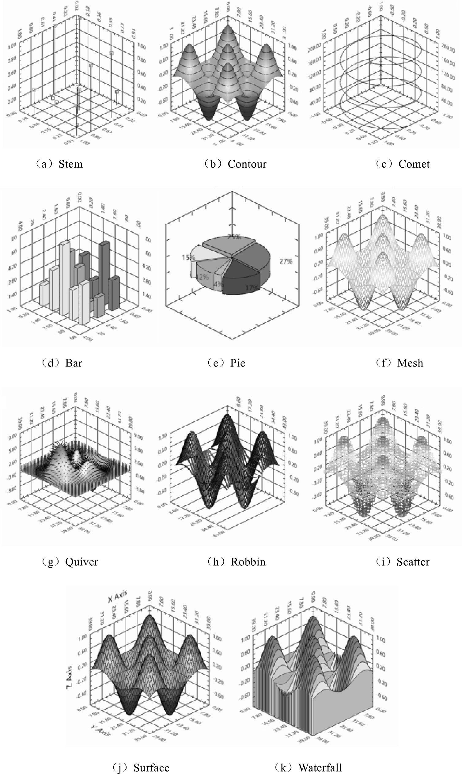 基于面向对象技术的3D Graph控件的使用方法与2D Graph控件的使用方法类似。当在前面板添加3D Graph控件后,LabVIEW会自动在程序框图上放置相应的Helper VI,并将其与3D Graph控件的图标相连。要绘制的数据传递给控件后,Helper VI会将输入数据类型转换为3D Graph接受的通用数据类型进行绘制。也可以在设计时通过右击控件,从弹出的菜单中选择3D Plot Property选项,调出三维图形属性对话框,对绘图过程进行配置。读者可以参考LabVIEW自带的Math Plot-3D实例(代码也可在本书代码中找到)进一步了解其使用方法,此处不再赘述。图3-54显示了Math Plot-3D实例的绘图结果。