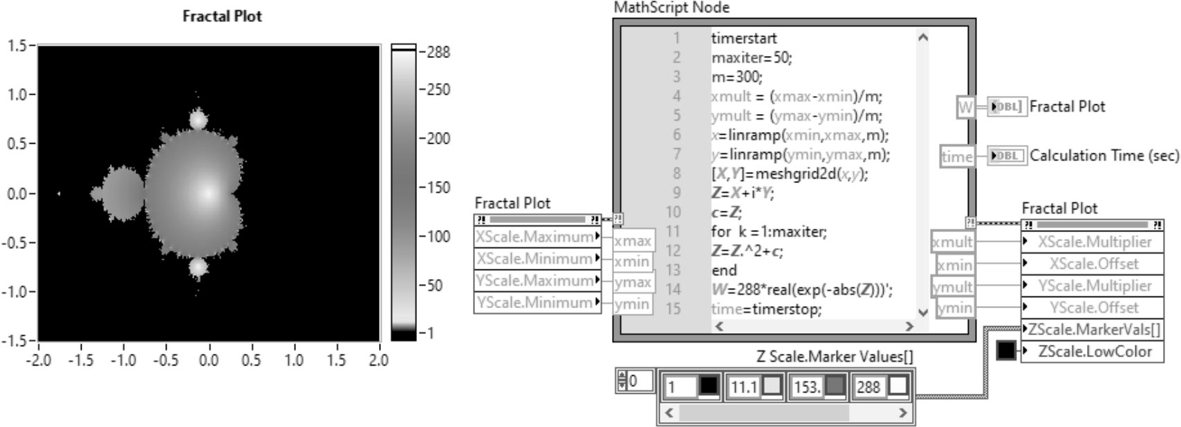图3-55显示了一个使用Intensity Graph绘制曼德博分形(Fractal)的实例。分形理论由本华·曼德博(Benoit B. Mandelbrot)首先提出,目的是描述人们在自然界中观察到的不规则形状,反映无限的细节、无限的长度和不光滑的曲线特性。能更加趋近复杂系统的真实属性与状态的描述,更加符合客观事物的多样性与复杂性。曼德博集合(Mandelbrot set,或译为曼德布洛特复数集合)是一种在复平面上组成分形(Fractal)点的集合。它与朱利亚(Julia)集合相似,均使用相同的复二次多项式进行迭代。图3-56的实例中使用了LabVIEW的MathScript节点中的文本代码,实现了色彩映射的数学计算,并最终使用计算结果修改强度图的属性。MathScript节点的使用将在第12章进行详细介绍,读者目前可不必纠结本例中文本代码的细节,只需重点了解通过属性实现颜色映射的过程即可。此外,程序中还通过ZScale.MarkerVals[ ]和ZScale.LowColor属性修改了Z标尺标记值和小于最小索引值的对应颜色。