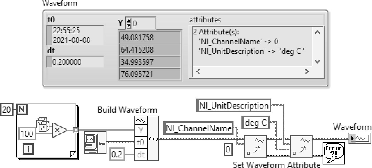 数字波形数据簇类型包括起始时间、时间增量信息和表格形式表示的数字数据,用于表示一个数字波形。表格数字数据中从右到左的每一列代表一个通道中的数字数据,在数字图形控件中显示为行。波形数据还可以包含信号的各种信息,如信号名称、采集信号的设备等,这些信息成为波形的属性。NI数据采集软件可自动设置某些属性。LabVIEW提供专门的VI,用于访问和操作波形数据及其属性(位于LabVIEW的Programing→Waveform函数子选版中),以简化与之相关的开发工作,如创建波形数据、读取和设置波形属性等。图3-49显示了一个构建带有属性元素波形数据簇的实例。