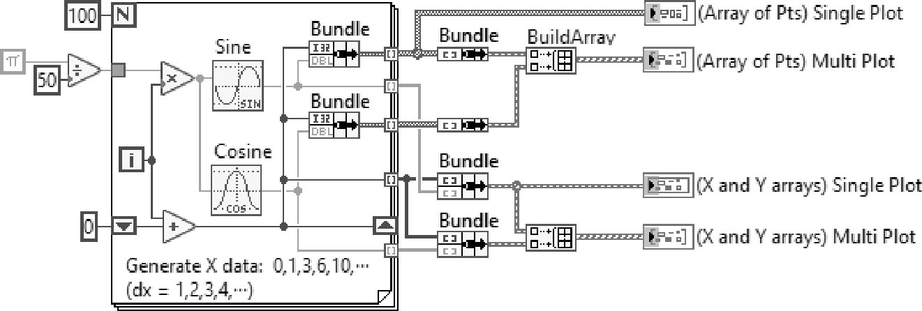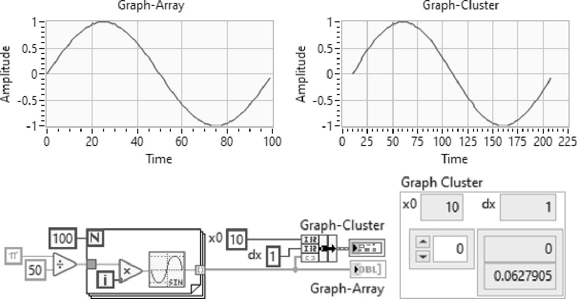 在使用Waveform Graph控件显示单个曲线时,一般使用数组或包含初始 x 值、 x 值的增量信息dx和 y 值数组的图形数据簇。对于数值数组,每个数据被视为图形中的点,从 x =0开始,以1为增量递增 x 索引。若传递的数据为簇,图形控件就以 x 初始值开始,以增量信息dx为步长,将 y 值数组中的值逐个绘制出来。图3-46所示实例使用For循环生成 y 数值数组,并分别以数组和簇的方式将数据传递至图形控件进行显示。在使用簇方式时, x 轴的初始值为10,增量dx为2。