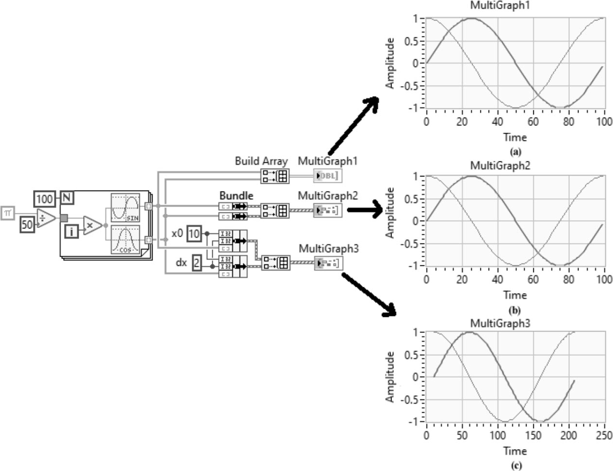 (3)将包含初始 x 值、dx及 y 数据数组的簇数组传递给Waveform Graph控件。绘制多条曲线时经常使用这种数据类型,用它可灵活指定唯一的起始点和每条曲线的 x 标尺增量(图3-47(c))。