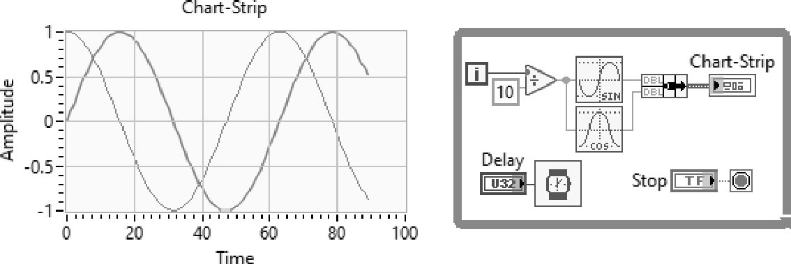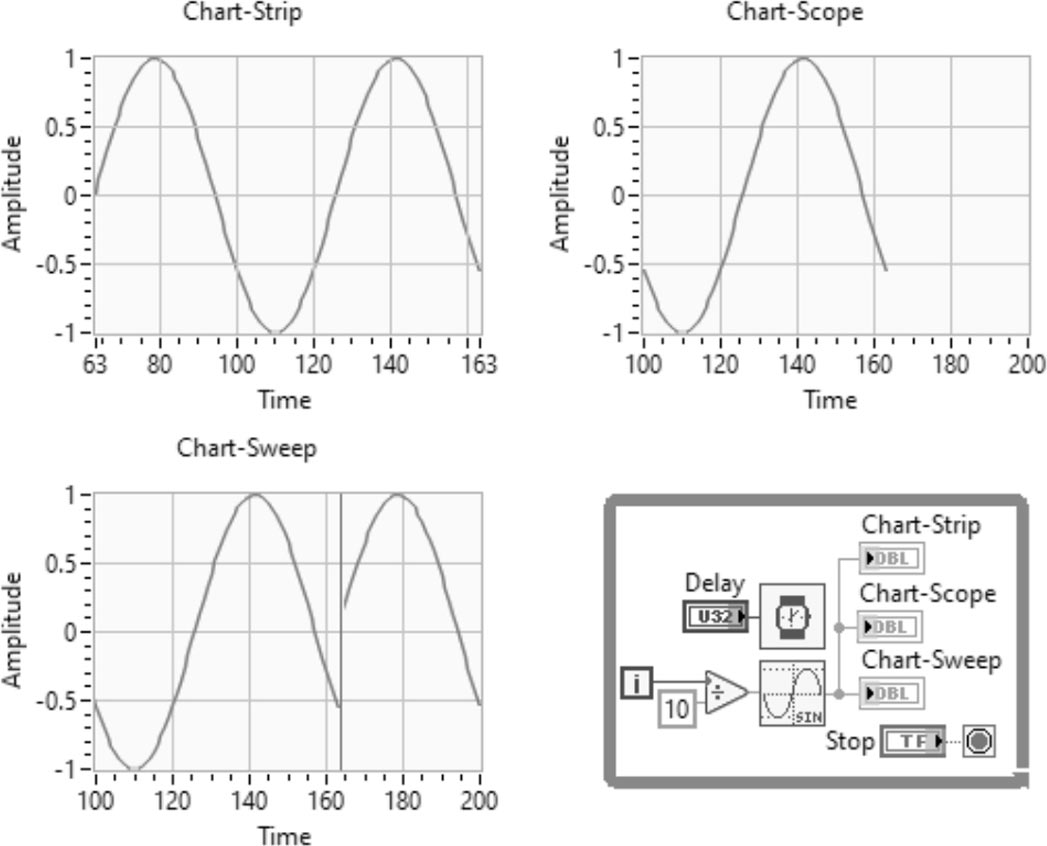 与Graph相反,Chart用于将数据源(例如采集得到的数据)在某一坐标系中,实时地显示出来。Chart是把新获得的数据点追加到已显示的数据上形成数据历史记录,因此可反映被测物理量的变化趋势。在Chart中,可结合先前采集的数据查看当前读数或测量值。当在Chart中新增数据点时,绘制的曲线将会滚动显示,即Chart右侧将出现新增的数据点,同时旧数据点在左侧消失。Chart一般用于每秒只增加少量数据点的慢速过程,这与传统的模拟示波器、波形记录仪非常相似。由于中文图形和图表从字面意义上容易混淆,且较难区分它们在显示和更新方式上的差异,因此建议在实际使用中不对这两种控件名做中文翻译,直接称为Graph和Chart即可。