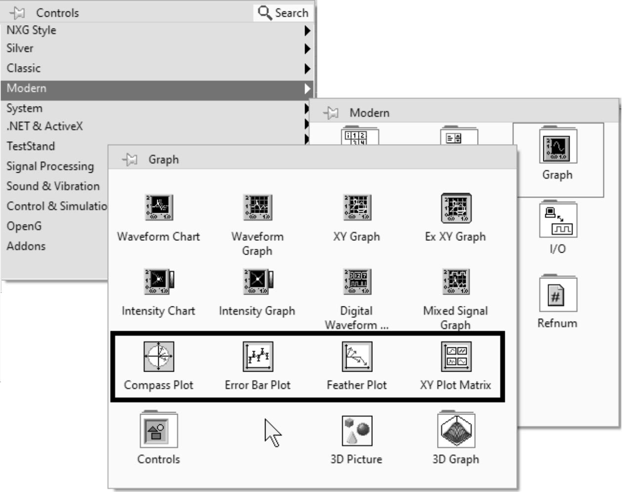 二维图形(2D Graph)控件是一些比较常用的特殊的XY Graph控件,主要包括位于LabVIEW控件工具箱中Modern→Graph选项中的几种,如图3-52所示。