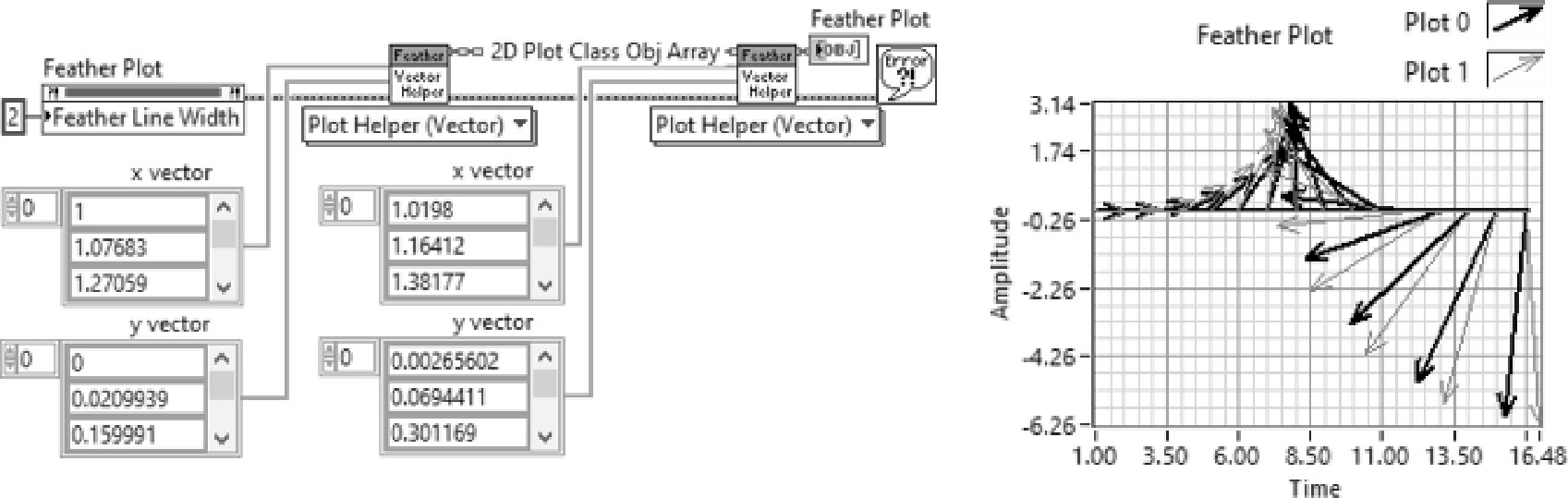 使用类和对象对相关实现细节进行封装后,开发人员在使用这些2D Graph时就不必再关心这些细节,只需传递输入数据即可。若要修改2D Graph的显示方式,可以使用程序修改其属性来完成。图3-53显示了2D羽状图的实例。程序先通过属性将羽状线的宽度更改为2,然后再将两个羽状图的数据传递给Plot Helper VI,该VI使用这些数据创建羽状图的类对象,完成数据转换等处理后将两个羽状图先后绘制在同一幅图中。