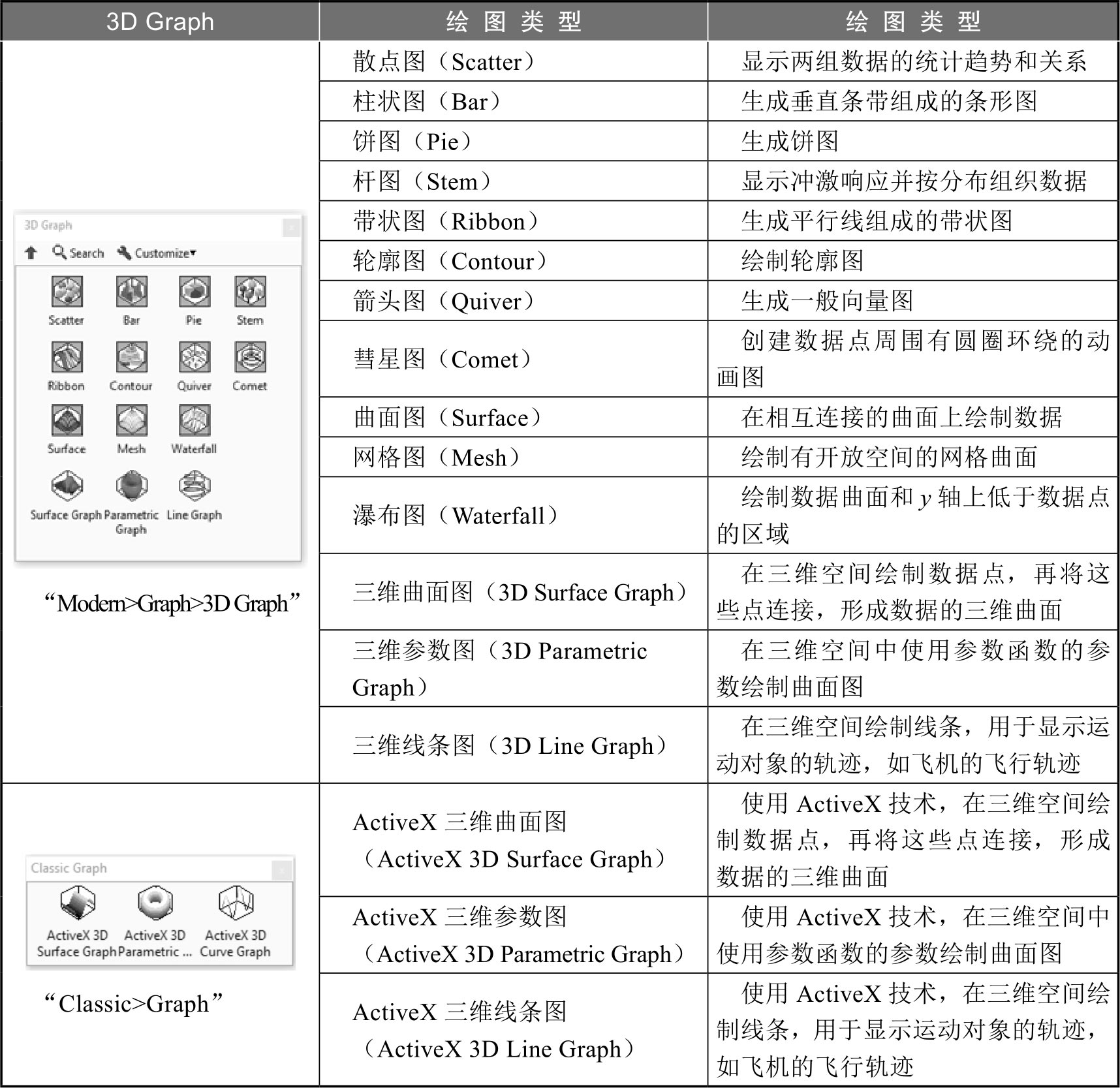 大量实际应用中的数据,需要在三维空间进行可视化显示。如研究某个平面的温度分布或飞机的运动等。LabVIEW提供两类三维图形(3D Graph)控件,一类基于面向对象技术,另一类基于ActiveX技术。基于面向对象技术的3D Graph控件与2D Graph控件类似,使用类对象封装了数据类型转换和操作过程,以方便开发人员直接使用。这些控件位于LabVIEW控件工具箱Modern→Graph→3D Graph选项下。基于ActiveX技术的控件位于LabVIEW控件工具箱Classic→Graph选项下。表3-8是对这些控件的汇总及简要描述。