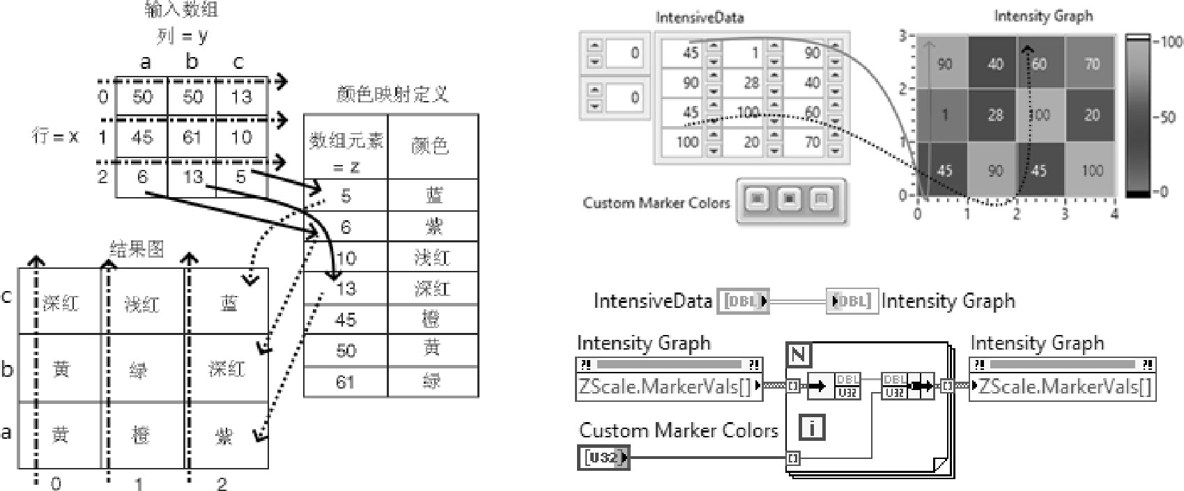 强度图形(Intensity Graph)和强度图表(Intensity Chart)通过在平面上放置颜色块的方式在二维图上显示三维数据。例如,温度图和地形图(以量值代表高度)的图形数据。Intensity Graph和Intensity Chart以一个包含颜色索引的二维数组和一个定义颜色映射的一维数组作为输入,其中二维数组索引可表示图形颜色的位置,而每一个数值代表一个特定的颜色。默认情况下,数据行在Intensity Graph或Intensity Chart上以列的形式显示,数组索引与颜色块的左下角顶点对应,且最多可显示256种不同颜色。图3-55的实例演示了Intensity Graph的显示原理(Intensity Chart的原理与之相同)。如果希望以行的方式显示数据,可右击该强度图形或图表,从弹出的菜单中选择“转置数组”(Transpose Array)选项进行设置。