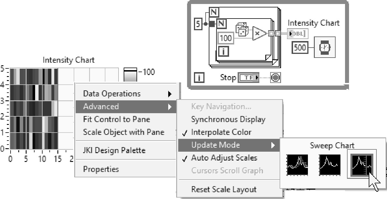 Intensity Chart是图表(Chart)的一种,因此它也具图表的特点。Intensity Chart有Strip、Sweep和Scope三种显示模式,在绘制过程中会在缓冲区中保留之前已绘制的历史数据。Intensity Chart缓冲区的默认大小为128个数据点。可通过右击Intensity Chart,从弹出的菜单中选择历史长度来配置缓冲区大小。Intensity Chart的显示需要占用大量的内存。如连续运行,历史数据将会越积越多,并要求更多的内存空间。当缓冲区中存满历史数据后,LabVIEW就停止占用内存。注意,LabVIEW不会在VI重新打开时清除图表的历史数据,若要在程序运行过程中清除强度表的历史数据,可将空数组传递给强度表的历史数据属性节点。图3-57是使用强度表扫描模式实时显示5×5矩阵中随机数据的实例。
