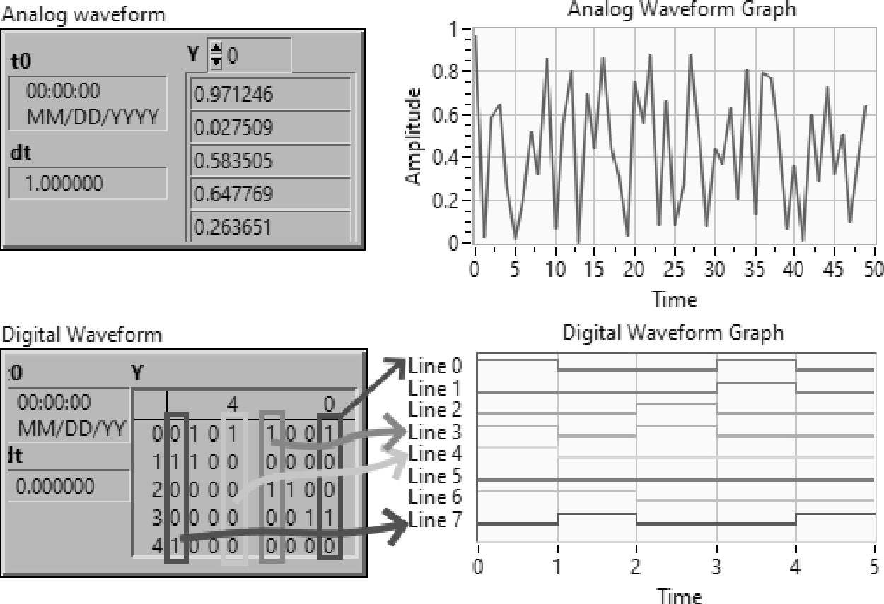 特别地,LabVIEW为信号处理过程中各种图形的显示,提供“波形”(Wave form)数据簇类型,包括模拟波形(Anal og Waveform)和数字波形(Digi tal Waveform),如图3-48所示。它们可以在Express VI使用过程中转换为动态数据类型。一个波形数据类型的一维数组可表示多个波形。