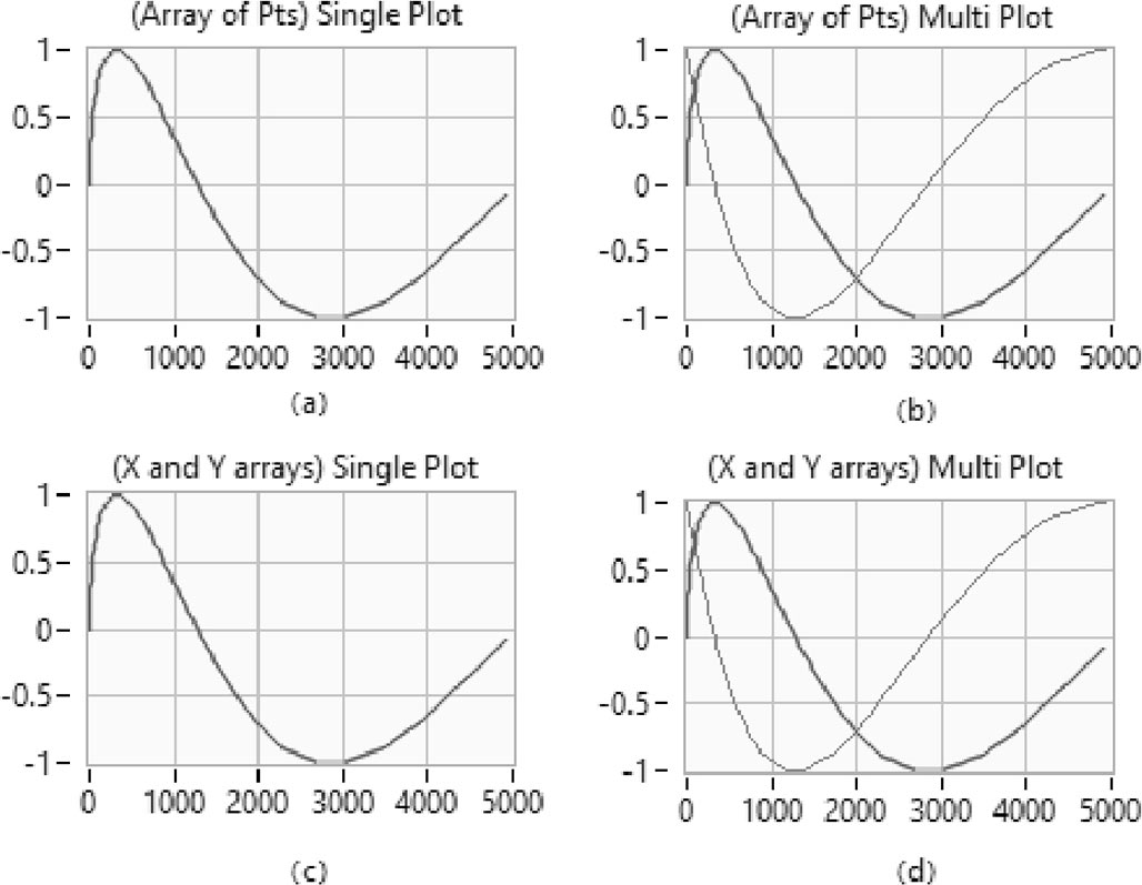 波形图形(Waveform Graph)控件的显示和更新方式与Waveform Chart不同,它通常先缓冲所有数据至数组中,然后一次性绘图。当数据被绘制后,会丢弃先前绘制过的数据,显示新数据。Waveform Graph控件支持多种数据类型,可以有效降低数据在显示为图形前进行类型转换的工作量,从而提高程序的运行效率,通常用于在数据连续采集的项目中,进行曲线的快速实时绘制。