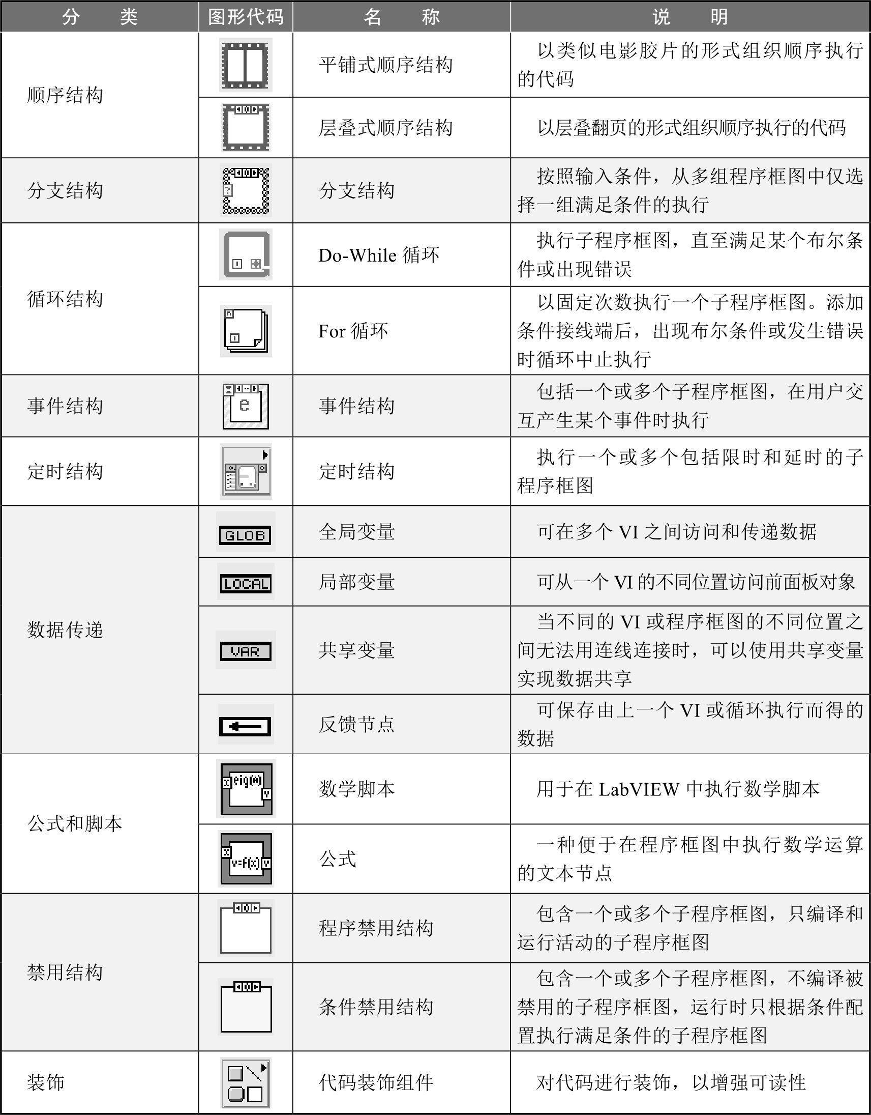 表4-1 LabVIEW程序结构分类说明