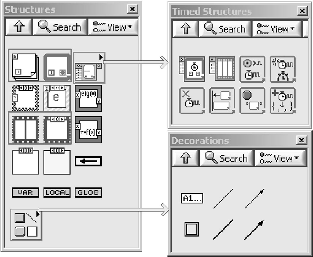 为了程序控制方便,LabVIEW将三种基本程序结构演化为多种表现形式(图4-3)。主要包括顺序结构、分支结构、循环结构、事件结构(Event Structure)、公式(Formula)、脚本(Scripts)、禁用结构(Disable Structure)和装饰组件(Decoration)等。虽然种类繁多,但从根本上均能归类到三种最基本的程序结构之一,或看作是基本程序结构的组合。