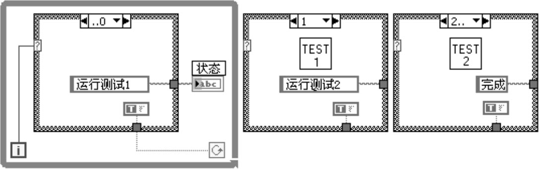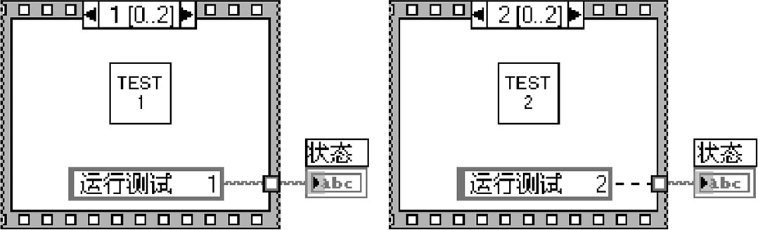 虽然分支结构、层叠式和平铺式顺序结构都包含多个帧,但是它们使用数据通道的方法有本质的区别。顺序结构的通道只能有一个数据源,而输出可以来自任意帧。如使用平铺式顺序结构,则顺序结构的外部数据可在每帧执行时输入该帧,帧执行完毕后将返回该数据。如果使用层叠式顺序结构,只有当所有与结构相连的数据输入后才会开始执行该结构。只有当所有帧执行完毕后,各个帧才会返回所连接的数据。要将数据从一个帧传递给平铺式顺序结构中的其他帧时,可将该帧的隧道与结构中的其他帧相连。可以将帧或帧的输出与其他帧相连接。如图4-12所示的例子中,某个用于测试应用程序的VI含有一个状态显示控件,用于显示测试过程中当前测试的名称。如果每个测试都是从不同帧调用的子VI,则不能在每一帧中更新显示控件,层叠式顺序结构中断开的连线便说明了这一点。