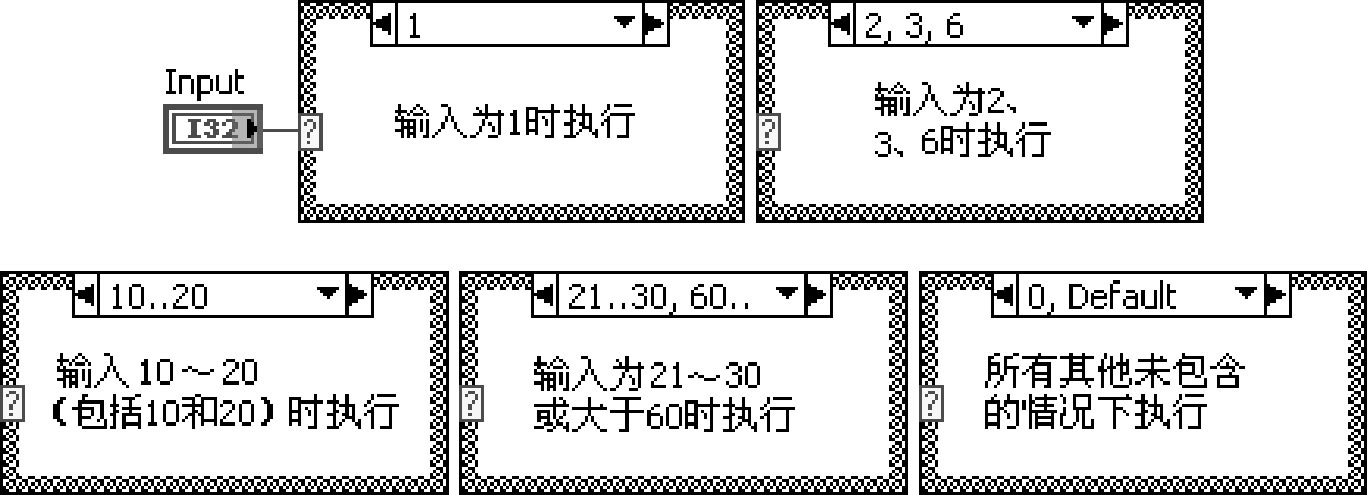 如果连接到“分支选择器接线端”的数据类型为数值类型,则必须在“分支选择器标签”中指定相应的值与用来选择要执行的分支。“分支选择器标签”中的值可以是单个值、多个值(数值之间用逗号隔开),或者是一个范围或多个范围。如使用数值范围,可以使用符号“..”来声明。例如,要设定10~20的所有数字(包括10和20)作为一个范围,可以输入10..20。也可以设定开集范围,例如,..100表示所有≤100的数,100..表示所有≥100的数。还可以指定多个范围(范围之间用逗号隔开),如..5,6,7..10,12,13,14。当在同一个条件选择器标签中输入的数值范围有重叠时,分支结构会自动以更紧凑的形式重新显示该标签。例如,上例中范围..5,6,7..10,12,13,14会被优化为..10,12..14显示。