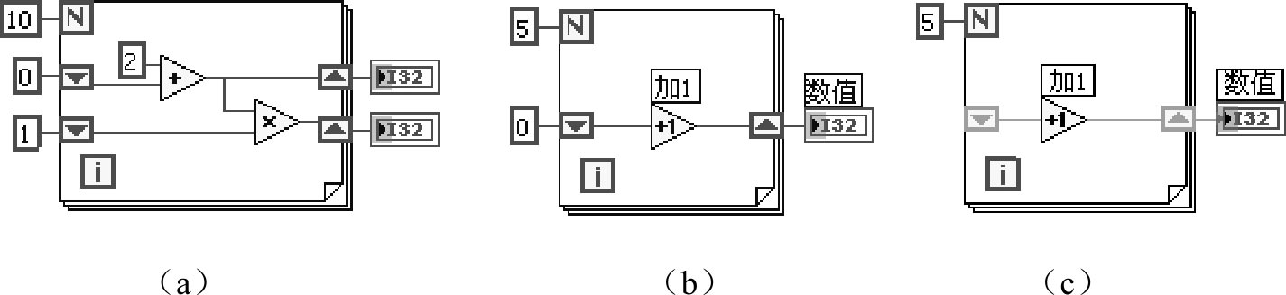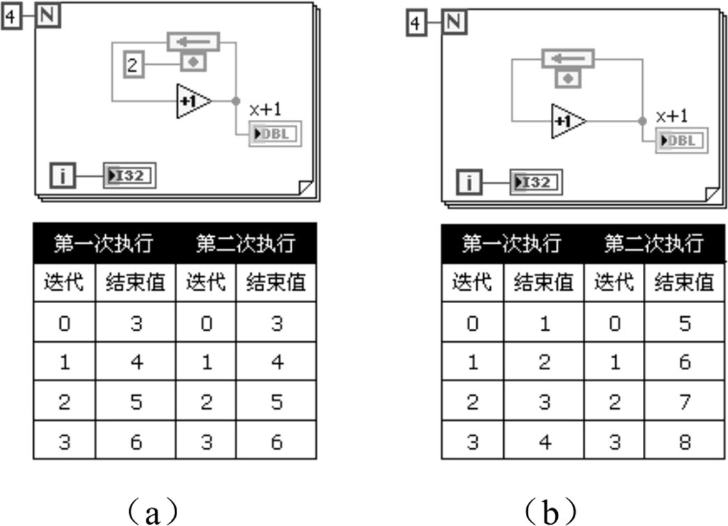 图4-21中,尽管反馈节点位于For循环内部,但初始化接线端在最外层While循环的边框上,于是反馈节点在每次While循环执行时被初始化为输入值2,而加1函数的结果在每次For循环执行时逐次递增。图4-22显示了一个初始化接线端已连线的反馈节点以及一个初始化接线端未连线的反馈节点。在经过数次执行后它们得到的结果完全不同。图4-22(a)中的反馈节点在第一次执行后被初始化,故每次循环后值不改变。图4-22(b)初始化接线端未连接初始值,则反馈节点初始化接线端使用了数据类型的默认值0作为第一次循环的初始值,且在此后循环中不对反馈节点进行初始化。两个循环的运行结果分别如图4-22中所示。