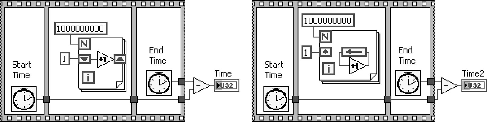 可以通过图4-20所示的两个简单例子来验证移位寄存器和反馈节点的执行效率,在LabVIEW 8.61版本中分别运行两个程序后发现,使用反馈节点的程序耗时12796ms,而使用移位寄存器的程序耗时仅9728ms。鉴于此原因,除非必要,在设计时笔者通常尽量避免使用反馈节点。