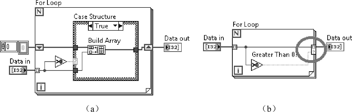 输出通道的自动索引还具有条件输出(Conditionally Writing Values)功能。该功能可以基于某一条件是否被满足,来确定数据值是否被添加到输出通道输出。虽然条件输出功能可以通过LabVIEW程序代码以其他方式实现,但是使用它却可以有效简化LabVIEW程序代码。例如图4-16(a)中程序代码仅限定当Data in的值大于0时,才将其值添加到数组中并输出到Data out,该程序代码可以很方便地通过图4-16(b)中的条件输出索引来实现。