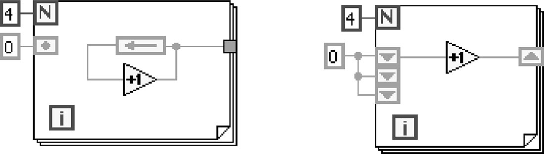 图4-19给出了分别使用反馈节点和移位寄存器实现4个1相加的例子。两个框图最终实现的功能相同,但是使用移位寄存器时可以将其扩展到层叠形式,保存之前多次循环中的值,而使用反馈节点时仅能保存之前一次循环的值。另外,使用反馈节点不必像移位寄存器那样将连线横跨循环左、右边框。在比较复杂的程序结构中,这可以有效减少贯穿于循环结构上的连线数量,从而有效地增加程序的可读性。然而,需要注意的是,反馈节点与LabVIEW数据流从左到右的规则有冲突,而且反馈节点在目前LabVIEW中的运行效率不及移位寄存器。