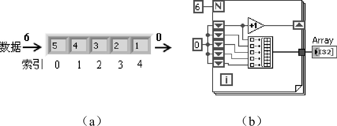 有时需要用到连续几次循环的数据,例如将连续三个采样数据进行平均,这时可以使用层叠式移位寄存器(Stacked Register)。右击循环上的移位寄存器的左侧接线端,从弹出的菜单中选择“添加元素”选项,可以创建层叠式移位寄存器或改变它的个数。层叠式移位寄存器可以保存之前多次循环的值,并将值传递到下一次循环中。它只位于循环左侧,与之对应的右侧接线端仅用于把当前循环的数据传递给下一次循环。如图4-18(a)所示,层叠式移位寄存器在功能上相当于一个小型的队列缓冲区,寄存器的数量决定了缓冲区的大小,每执行一次循环,缓冲区中的数据自动按照先进先出(FIFO)的原则进行一次更新。在图4-18(b)中,左侧接线端上添加了数量为5的层叠式移位寄存器,则连续5次循环的值将传递至接下来的循环中,其中最近一次循环的值保存在最上面的寄存器中,而上一次循环传递给寄存器的值则保存在与之相接的下一个接线端中,以此类推。