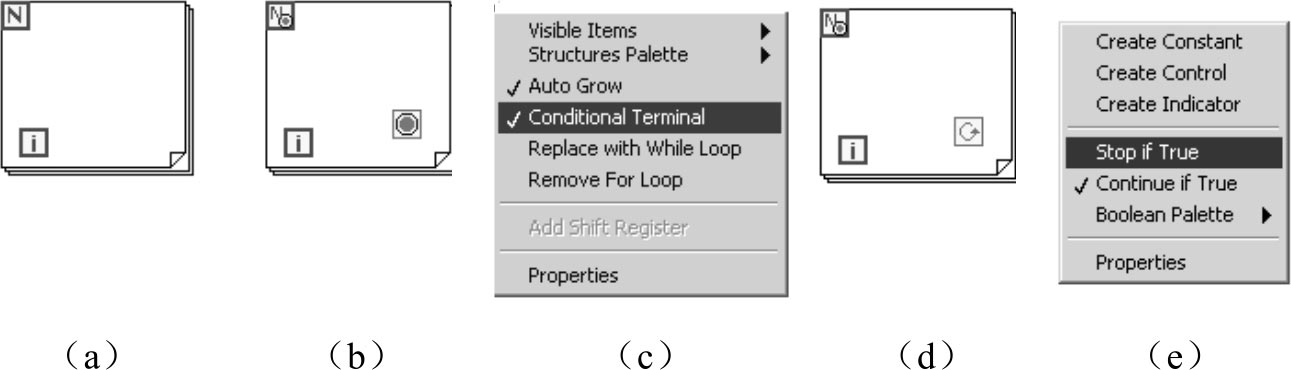 如果设定条件接线端为“真时停止”(Stop If True),For循环将在收到TRUE值、循环达到总循环数或自动索引的最大次数时停止执行。右击条件接线端并从弹出的菜单中选择“真时继续”(Continue If True)选项,条件接线端的动作和外观均改变(图4-14(d))。For循环将执行其子程序框图,直到条件接线端接收到一个FALSE值。