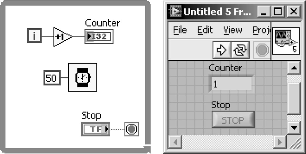 While循环类似于文本编程语言中的Do-While循环或Repeat-Until循环,它持续执行子程序框图直到满足某个指定的条件为止。While循环与For循环都可以包含条件接线端,但由于For循环同时还包括一个固定的循环总数,因此即使条件未发生,循环也不会无限运行下去;相反,对While循环却不能设定循环执行的总数,因此如果条件未发生,循环会无限地运行下去。另外,与For循环不同,任何While循环都至少要执行一次。如图4-15所示,当Stop控件的初始值为False时,While循环将执行一次,循环结束后Counter的值为1。