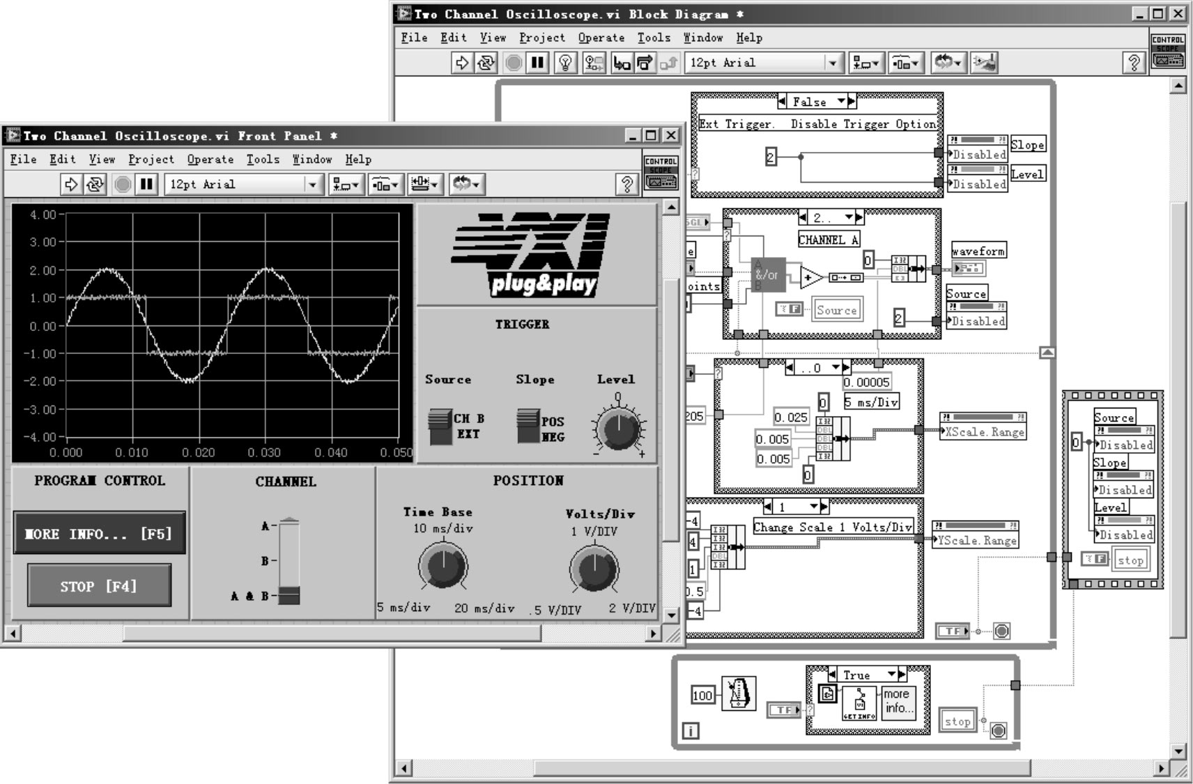 进行虚拟仪器开发的语言和工具很多。传统基于文本的开发语言有C/C++、Python、Java、C#、Basic等;基于文本语言编程的开发工具有Visual Studio(VC++/VB/VC#等)、Qt、Eclipse、Borland C++/Delphi、NetBeans以及Linux平台下的GCC和Gnome/GTK库等。但是这些软件多为通用的开发软件,面向多个行业,并不提供规范的虚拟仪器开发元件库和仪器设备驱动集。如果开发任务集中在自动化测控领域,使用它们往往需要从头开发各种虚拟仪器软件模块和硬件驱动,这就如同从每个螺丝钉开始造汽车一样,开发周期长,成本也高。
