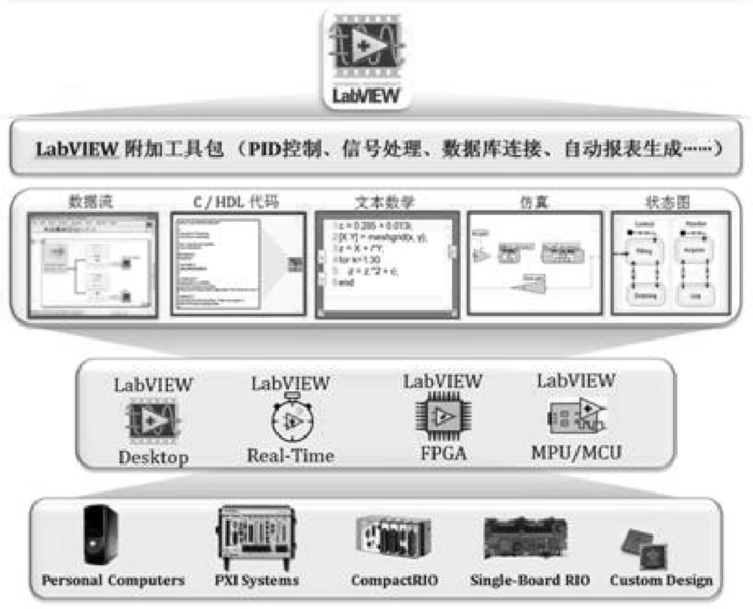 LabVIEW(Laboratory Virtual Instrumentation Engineering Workbench)是NI公司为测试、测量和控制应用而设计的可视化、跨平台(可在Windows、Linux、macOS上运行)系统工程软件。它使用图形化的程序设计语言代替文本行代码来创建应用程序,并可以快速访问和控制硬件和数据信息。传统文本编程语言根据语句和指令的先后顺序决定程序执行顺序,而LabVIEW程序的执行顺序则由程序框图中节点之间的数据流向决定,即数据流驱动(Data Flow Driven)。开发人员使用图标化的函数和数据连线,依据数据流逻辑来开发复杂的测量、测试和控制系统。LabVIEW广泛支持各种仪器硬件的驱动,包含大量内置和扩展的函数库(如数据采集、信号处理、数学计算、统计分析、图像处理、机器视觉、运动控制、数据通信、数据库、报表生成、移动开发、嵌入式开发等),并且都形象地表现为图形化编程语言函数。图1-3显示了LabVIEW图形化设计平台结构。