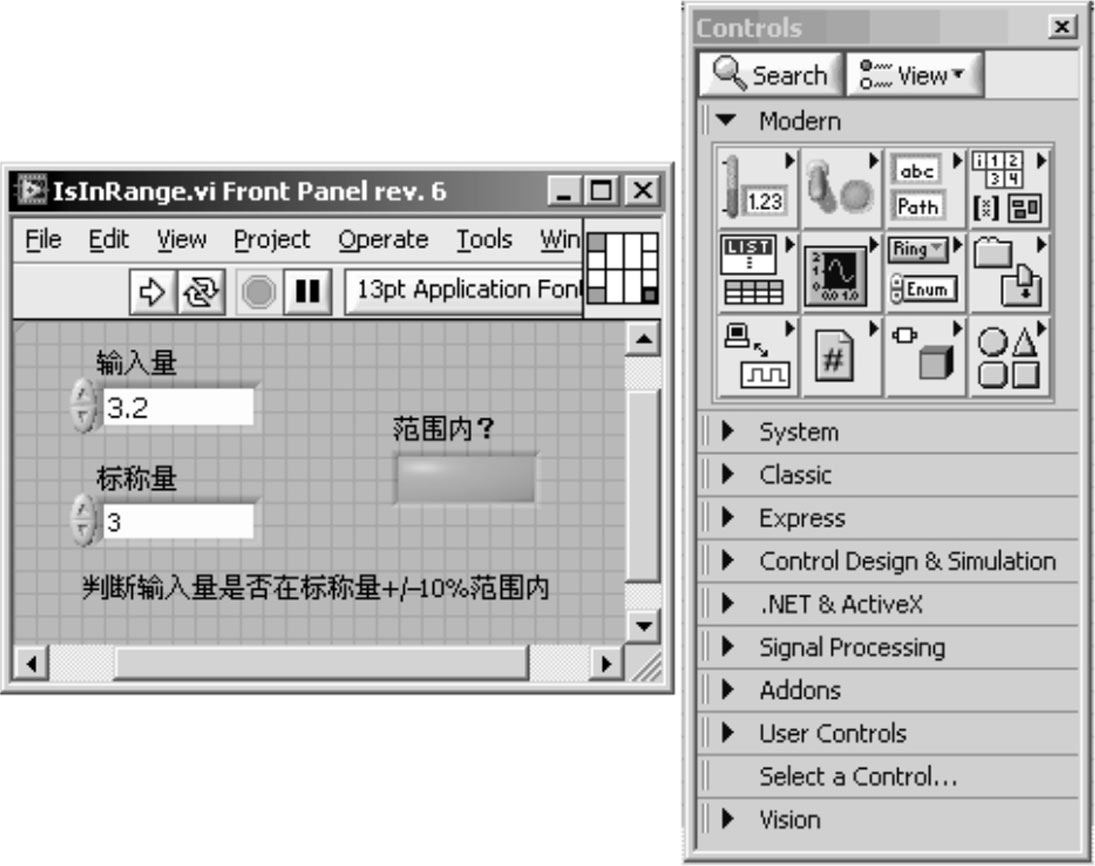 根据需求分析,用户前面板上应包含2个输入控件(输入量和标称量)和一个显示控件(显示输入量是否在范围内)。通过从控件面板中选择两个双精度类型的数字控件(Double Numeric Control)和一个方形LED (Square LED)作为显示控件,并修改其标签(Label)后,得到如图1-13所示前面板。