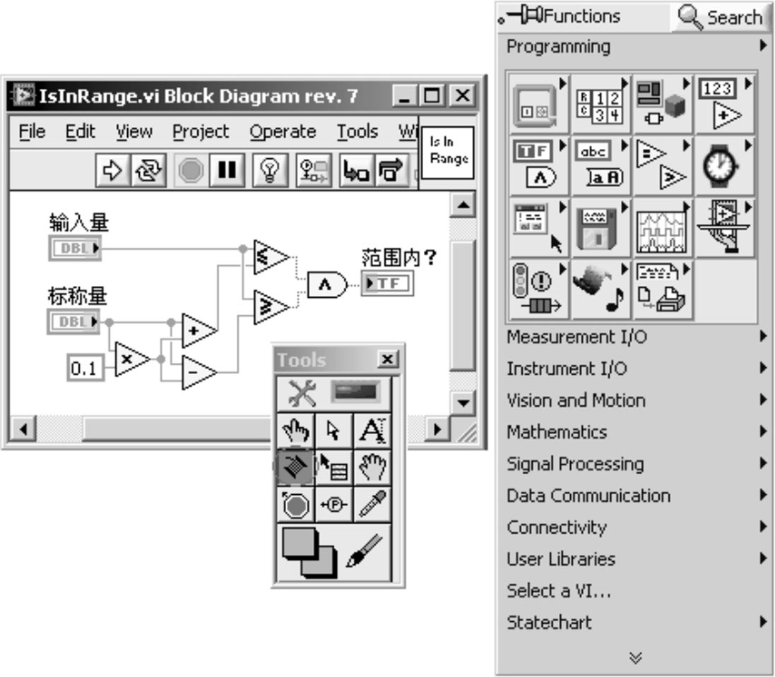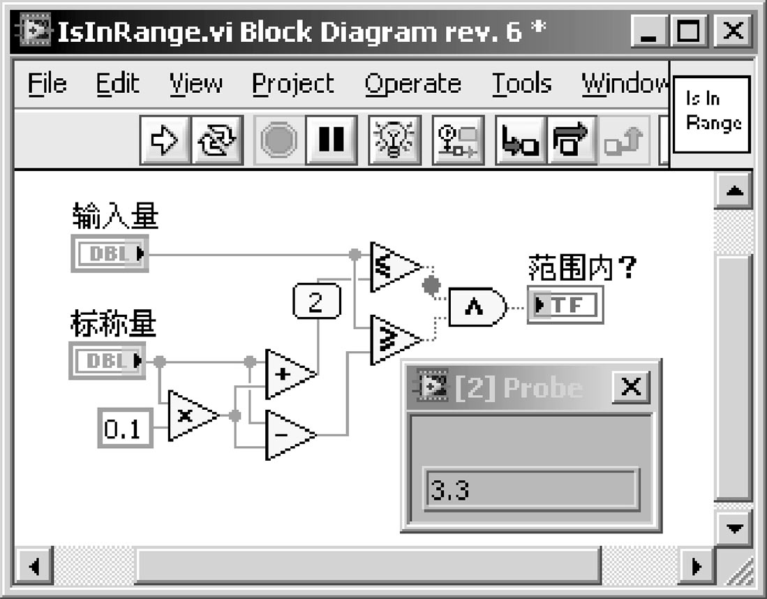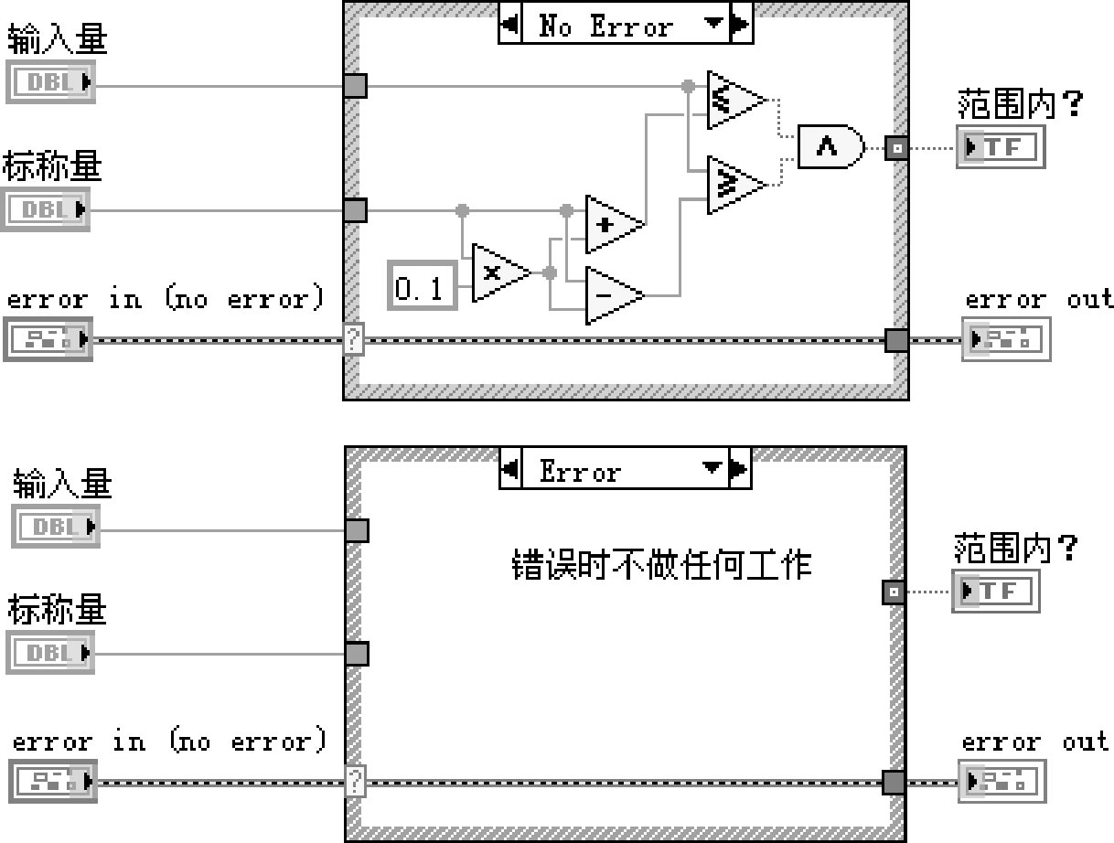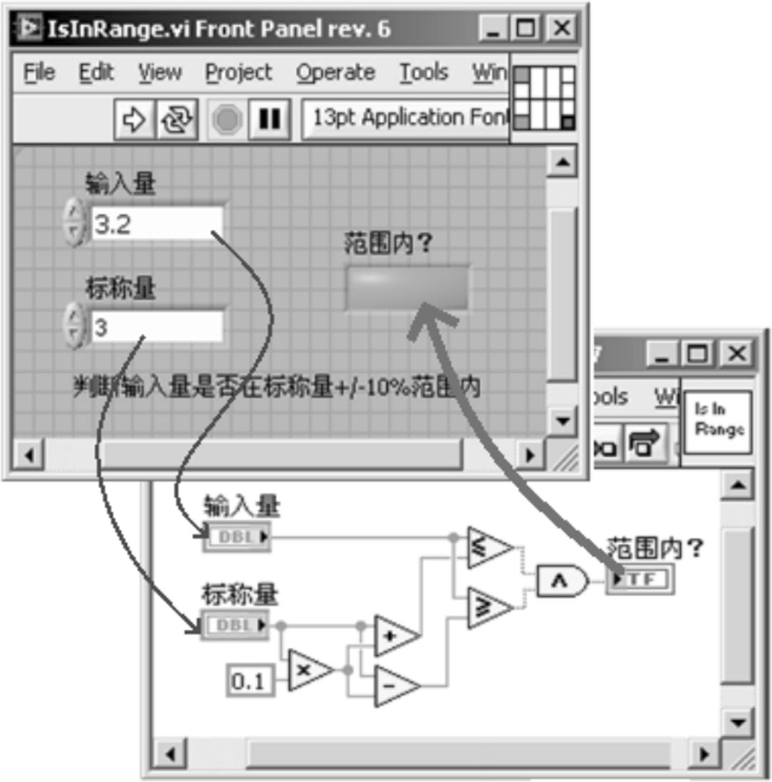 假定我们要完成一个VI,用于判断某种外部输入的实数量(如某种产品的输出电压、电流)是否在一个预先给定标称值的±10%范围内。