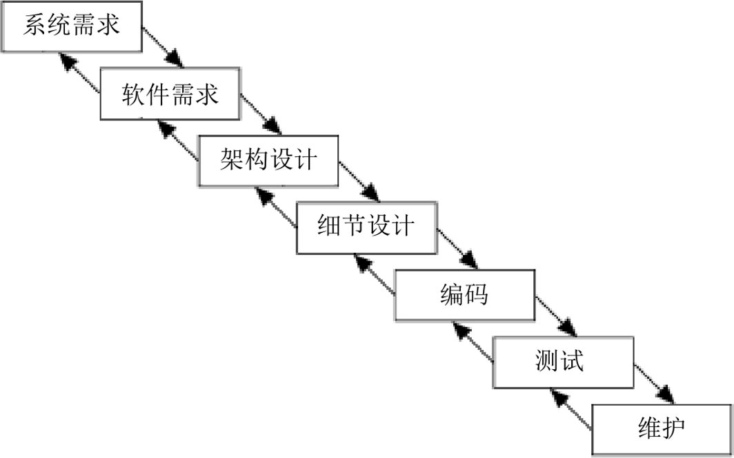 从产品生命周期的角度来看,有多种开发模型可供选择。在LabVIEW虚拟仪器项目开发中,根据所关心的重点不同及不同模型的优缺点,可以选择一种或多种。当工期比较紧张时,可采用编码修正模型(Code and Fix Model)立即着手编码;当对项目风险比较关心时,可以采用螺旋模型(Spiral Model)不断重复开发过程,以实现不同阶段项目风险的管理;当产品质量相对重要时,可以采用传统的瀑布模型(Traditional Waterfall Model)或修正的瀑布模型(Modified Waterfall Model)等。不同的开发模型对各开发步骤进行了不同限定和定义。例如采用传统瀑布模型的项目生命周期则包含系统需求分析、软件需求分析、系统架构设计、详细设计、编码、测试、升级维护等阶段(图1-21)。