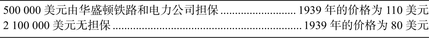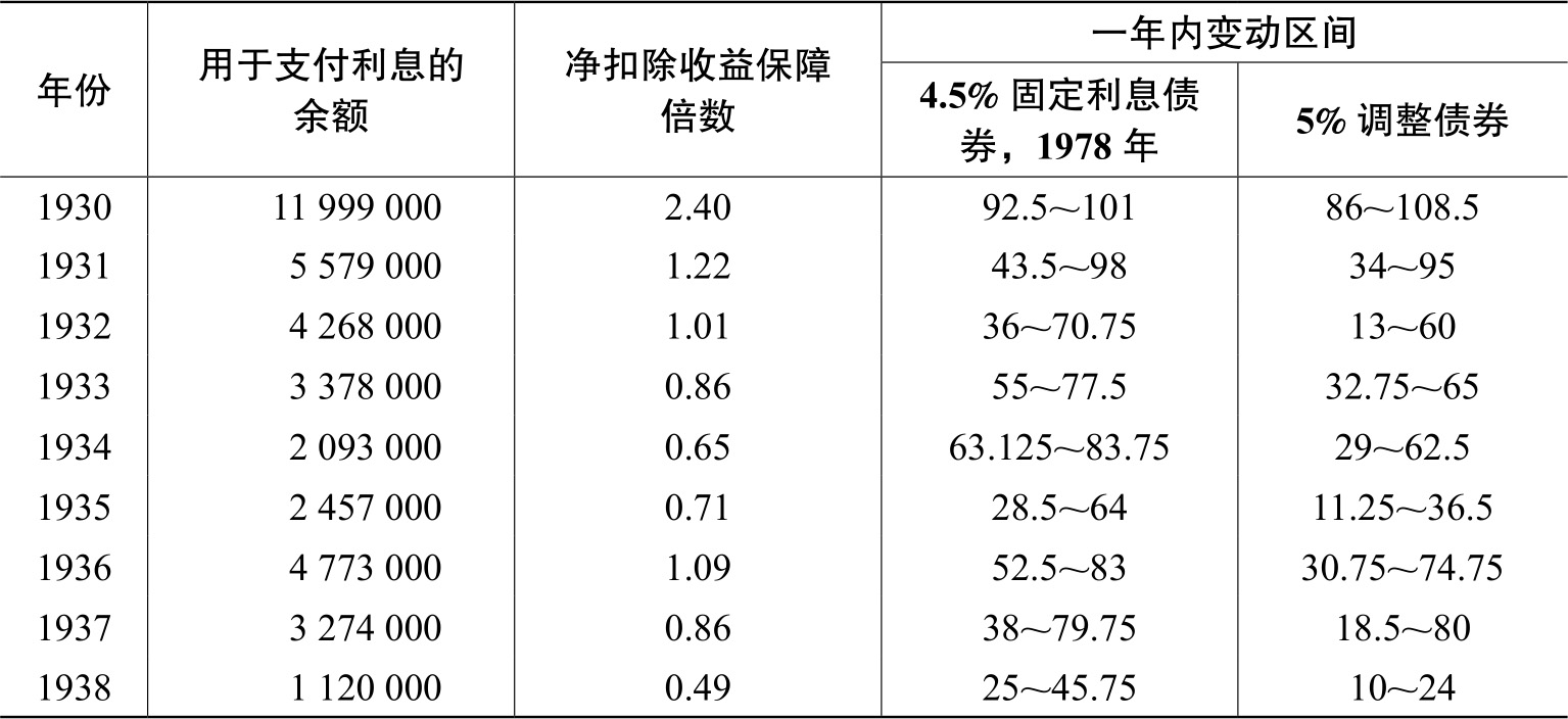 1934年后,调整债券的利息只在1937年被支付。债券价格的变动范围是个有趣的现象,主要反映了债券投资者的注意程度不够。比如,1937年价格到达高点时,虽然公司整体收益保障水平较低,且优先债券在1932年、1934年和1935年的价格高出调整债券两倍,投资者购买5%调整债券和4.5%固定利息债券的价格却相同。
