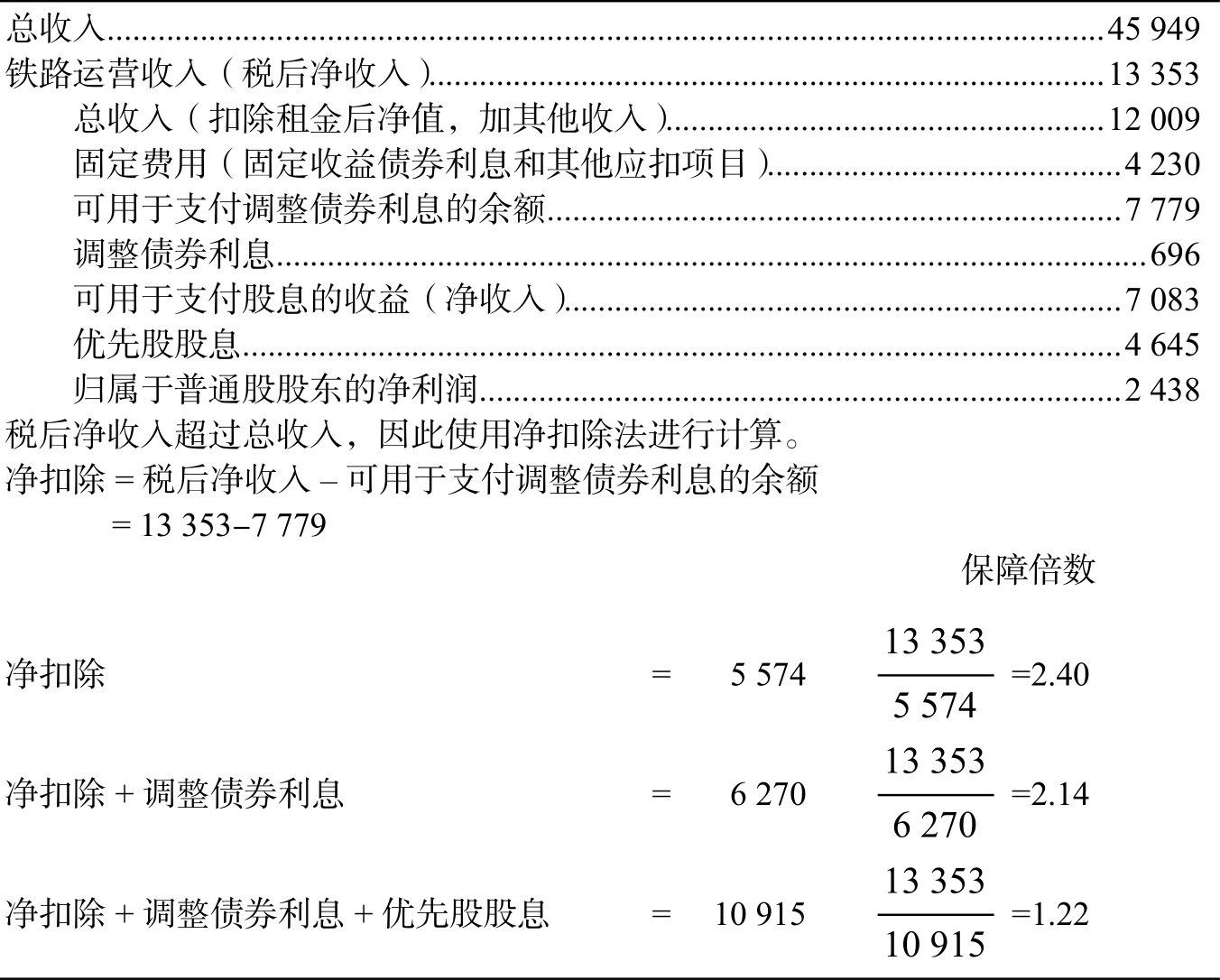 需要注意在计算固定利息债券的收益保障倍数时,总利息费用不包括收益债券或调整债券的利息。如此来看,收益债券的投资等级同优先股完全相同。另外还需要注意的是,统计部门公布的密苏里–堪萨斯–得克萨斯铁路公司收益达到5%调整债券的57.28%(即其利息保障倍数超过11倍)的数据是没有价值,或存在误导性的。