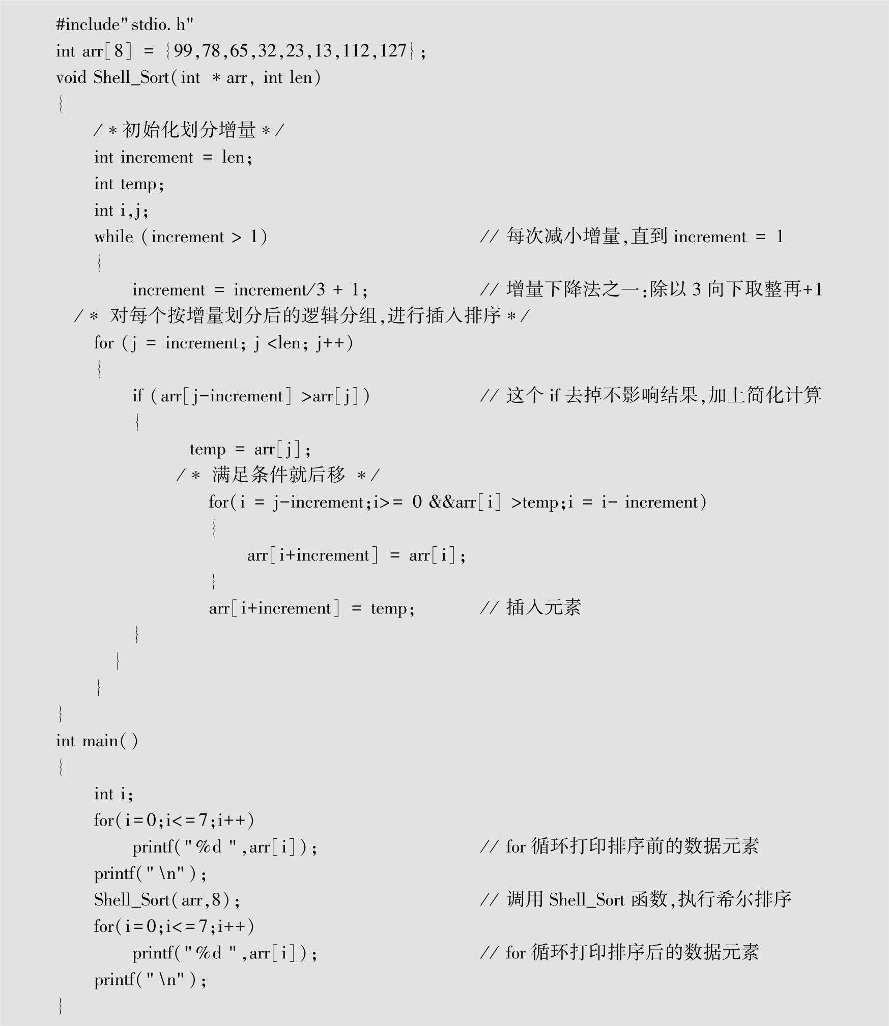 实现希尔排序算法的C语言代码如代码清单1-9所示。