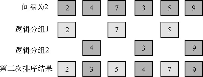 (1)取一个整数(increment,小于待排序序列中的数据元素总数)作为间隔,将所有距离为increment的数据元素放在同一个逻辑数组中,并对每一个逻辑数组中的数据元素通过插入排序算法对其中的数据元素进行排序。