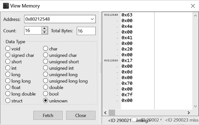 (5)单击“CPU Registers”标签,在“CPU Registers”标签页中找到寄存器名字为“s0”的一行,并用鼠标左键双击该行,弹出“View Memory”对话框,如图1.55所示。在图1.55中可以看出,用于存放数据段中名字为“arr”的存储空间的首地址为0x80212548,同时也可看到从该地址开始的8个要排序的数据,即0x0063(十进制数99)、0x004e(十进制数78)、0x0041(十进制数65)、0x0020(十进制数32)、0x0017(十进制数23)、0x000d(十进制数13)、0x0070(十进制数112)和0x007f(十进制数127)。