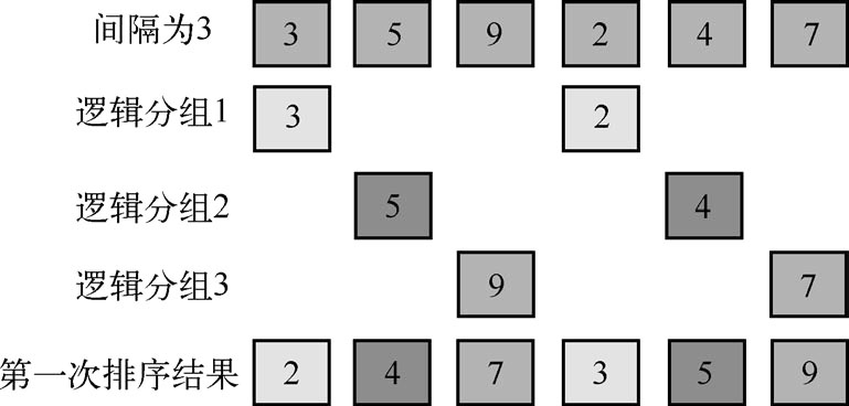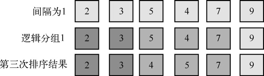 这样,将整个待排序序列划分为间隔为3的3个逻辑分组,对每一个逻辑分组内的数据元素进行插入排序,相当于对整个待排序序列进行了部分排序调整,如图1.47所示。
