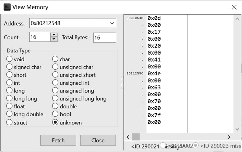 (8)单击“CPU Registers”标签,在“CPU Registers”标签页中找到寄存器名字为“s0”的一行,并用鼠标左键双击该行,弹出“View Memory”对话框,如图1.56所示。在图1.56中可以看出,用于存放数据段中名字为“arr”的存储空间的首地址为0x80212548,同时也可看到从该地址开始的8个已经排完序的数据,即0x000d(十进制数13)、0x00017(十进制数23)、0x0020(十进制数32)、0x0041(十进制数65)、0x004e(十进制数78)、0x0063(十进制数99)、0x0070(十进制数112)和0x007f(十进制数127)。