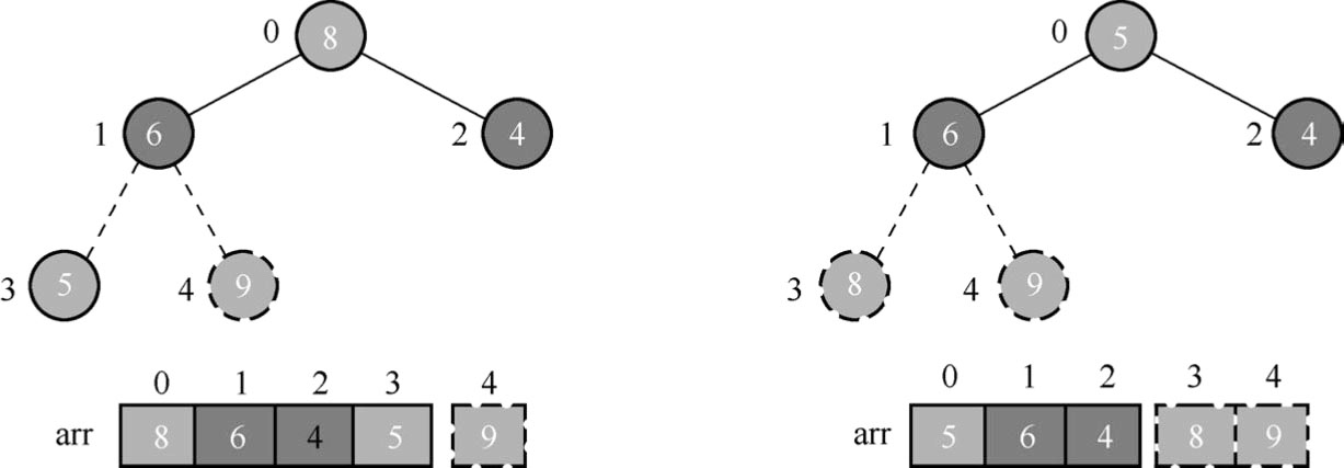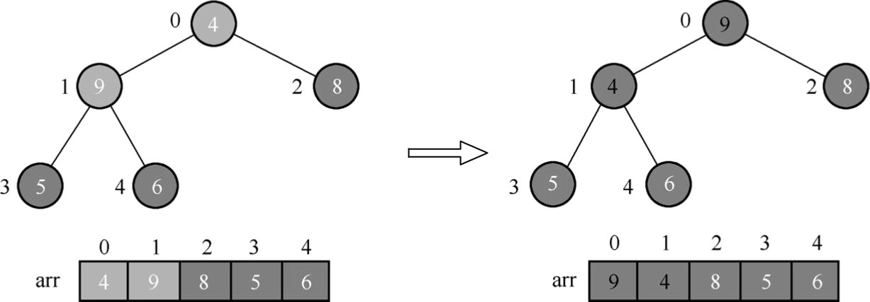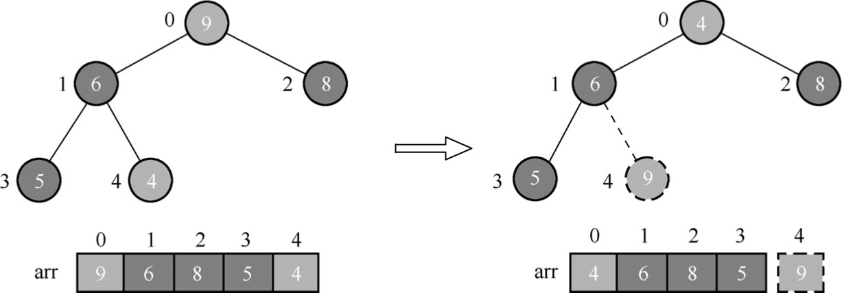 (5)将堆顶元素与末尾元素进行交换,使末尾元素最大,如图1.90所示。将堆顶数据元素9和末尾数据元素4进行交换。