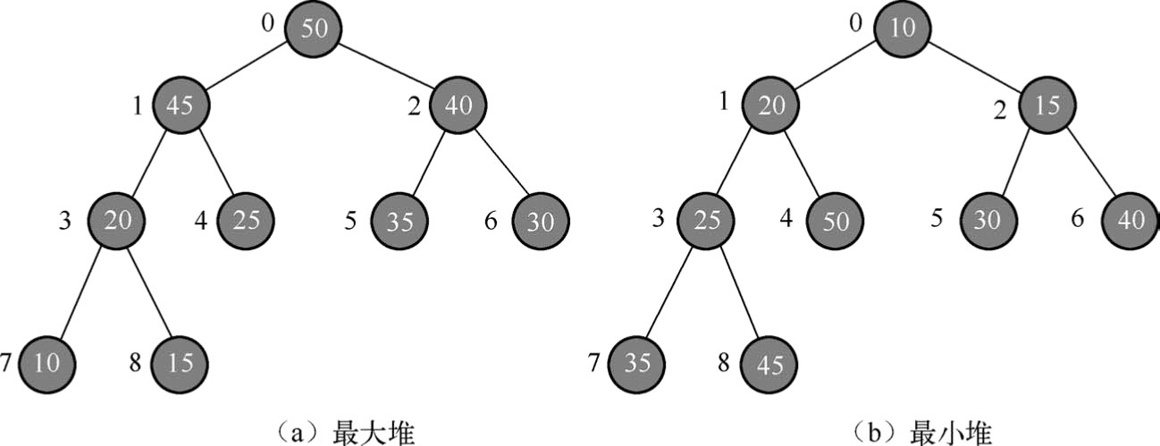 那什么是二叉堆(Binaryheap)呢?首先,定义一个完全二叉树。完全二叉树是一种二叉树,除可能的最后一层外,其余的每一层都被完全填满,并且所有节点都尽可能靠左。二叉堆是一个完全二叉树,以特殊顺序存储,使得父节点中的值大于/小于其两个子节点中的值。前者称为最大堆,如图1.84(a)所示;后者称为最小堆,如图1.84(b)所示。堆可以用二叉树或数组表示。