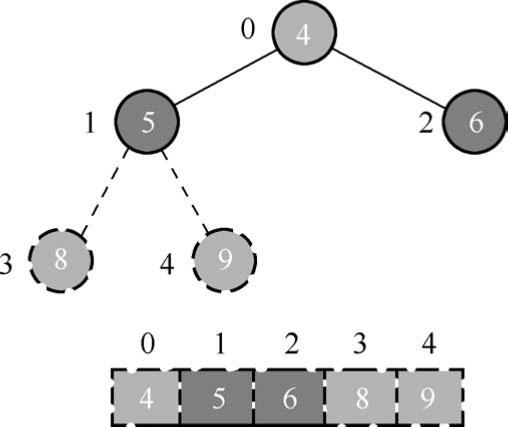 为什么用数组来表示二叉堆?这是因为二叉堆是一颗完全二叉树,它可以很容易地表示为一个数组,并且基于数组的表示可以节省空间。如果父节点保存在索引 i 处,则左孩子可以通过2× i +1计算,右孩子可以通过2× i +2计算(假设索引从0开始)。