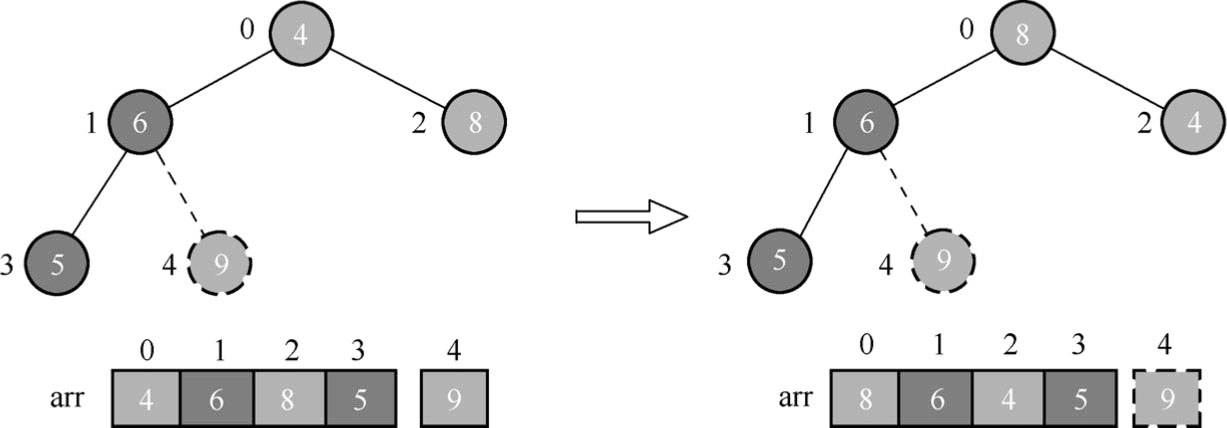 (6)继续调整最大堆,如图1.91所示。图1.91中,调整节点0和节点2中数据元素4和数据元素8的位置。