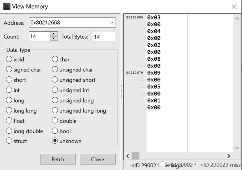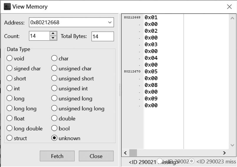 (9)单击“CPU Registers”标签,在“CPU Registers”标签页中,找到寄存器名字为“s0”的一行,并用鼠标左键双击该行,弹出“View Memory”对话框,如图1.100所示。在图1.100中可以看出,用于存放数据段中名字为“arr”的存储空间的首地址为0x80212668,同时也可看到从该地址开始的7个已经排完序的数据,即0x0001、0x0002、0x0003、0x0004、0x0005、0x0008和0x0009。