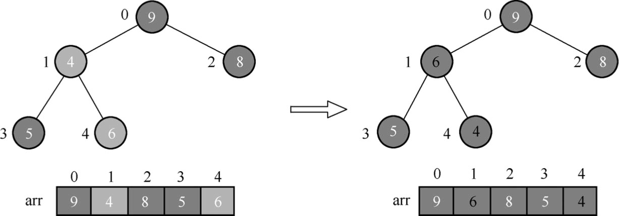 (4)由于前面的交换导致了子树的3个数据元素4、5和6的结构混乱。按照最大堆规则继续调整树的节点。因为在3个数据元素4、5和6中,数据元素6的值最大,因此交换数据元素4和数据元素6,如图1.89所示。