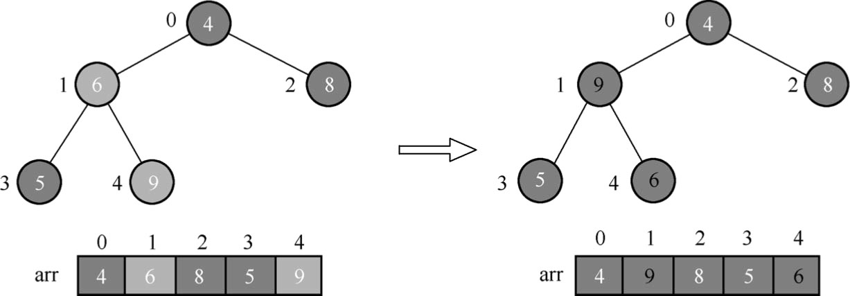 在将数据元素6和数据元素9比较交换之后,必须考虑内容为9的这个节点对于其子节点会不会产生任何影响?由于它是叶子节点,因此不用考虑这个问题。