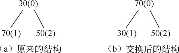 图1.85所示为“堆化”的一个例子。在图1.85中,由于孩子[70(1)]比父亲[30(0)]大,因此将孩子[70(1)]和父亲[30(0)]进行交换,如图1.85(b)所示。